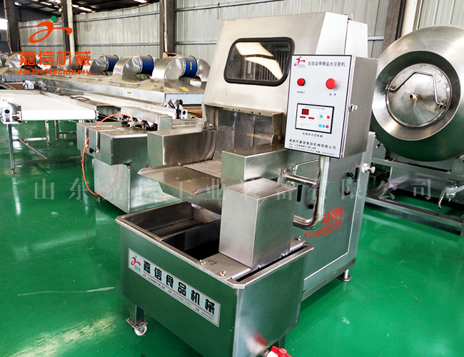 鹽水注射機是將鹽水及輔料通過鹽水注射、真空滾揉,注入肉中的料液充分腌漬,滲透,疏松肌肉組織結構,有利于肌球蛋白溶出,并且由于添加劑對原料肉離子強度的增強作用和蛋白等特點的調(diào)整作用,注入配制的水溶液能使肉質(zhì)嫩化、松軟,從而提高了肉制品的出品率和改善肉制品的嫩度和口感。可根據(jù)不同工藝要求,調(diào)整步進速度,步進距離,壓肉板間隙及注射壓力,將腌漬液均勻連續(xù)地注入肉中,達到理想的注射效果。
