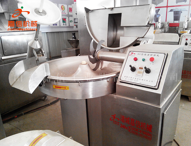 斬拌機(jī)利用斬刀高速旋轉(zhuǎn)的斬切作用,將肉塊,碎肉,脂肪等主要原料精細(xì)的斬切成肉餡或肉泥,同時(shí)將其它原料如水,冰片,輔料一起攪拌成均勻的乳狀物。斬刀高速旋轉(zhuǎn),可以縮短運(yùn)行時(shí)間,減少物料發(fā)熱量,保持餡料的天然色澤、彈性、出品率和產(chǎn)品的保質(zhì)期。